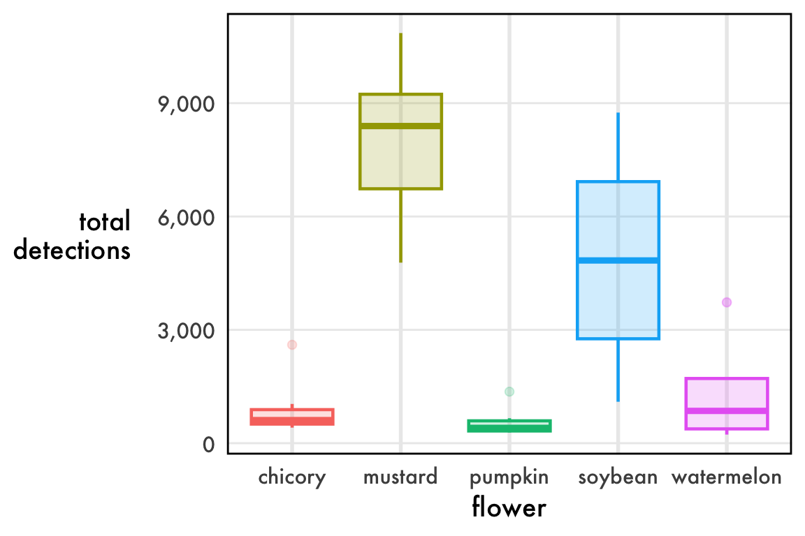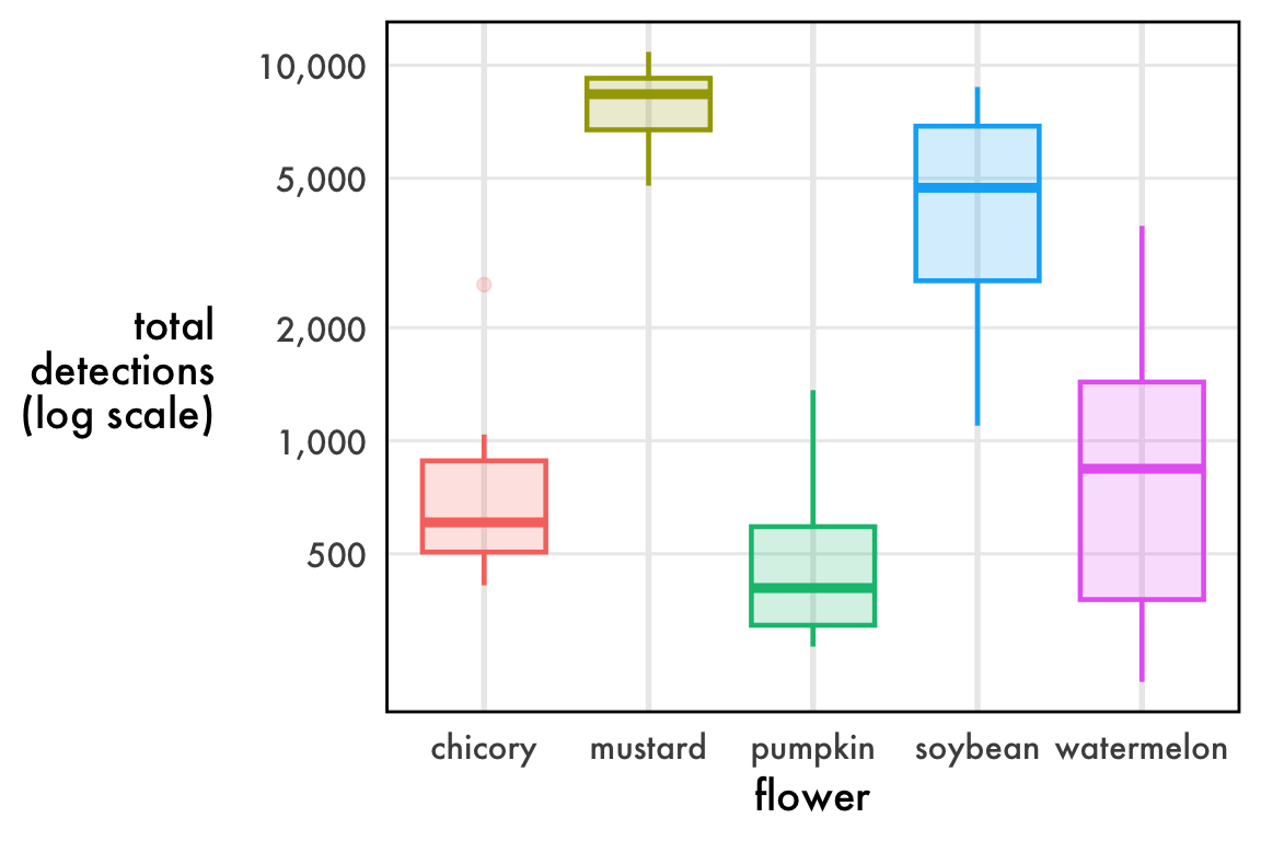 ylab('total\ndetections')Not bad, but what’s with the outliers? Chicory, pumpkin, and watermelon all have dots above the whisker, which are far from the center of the data.