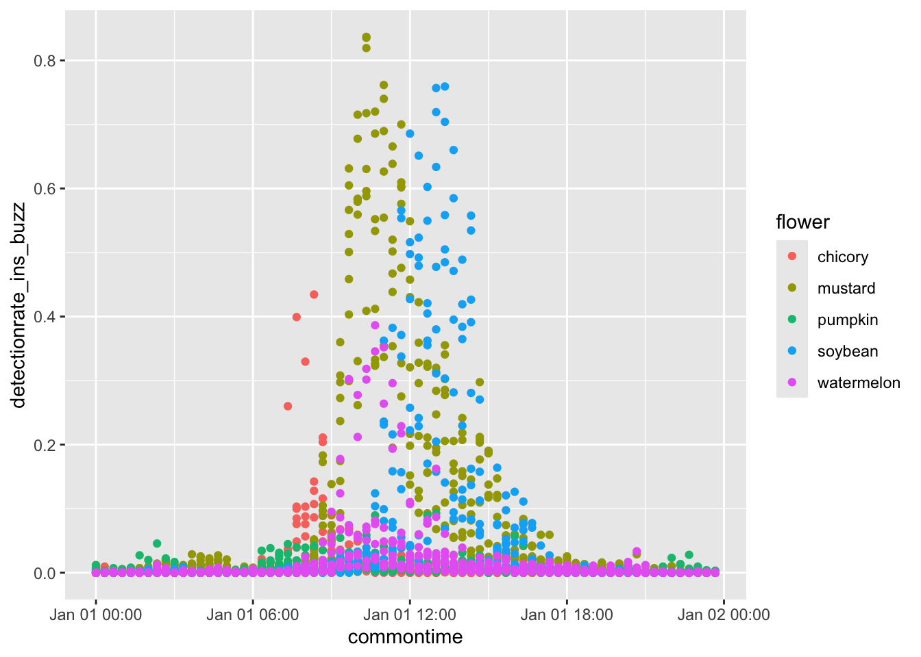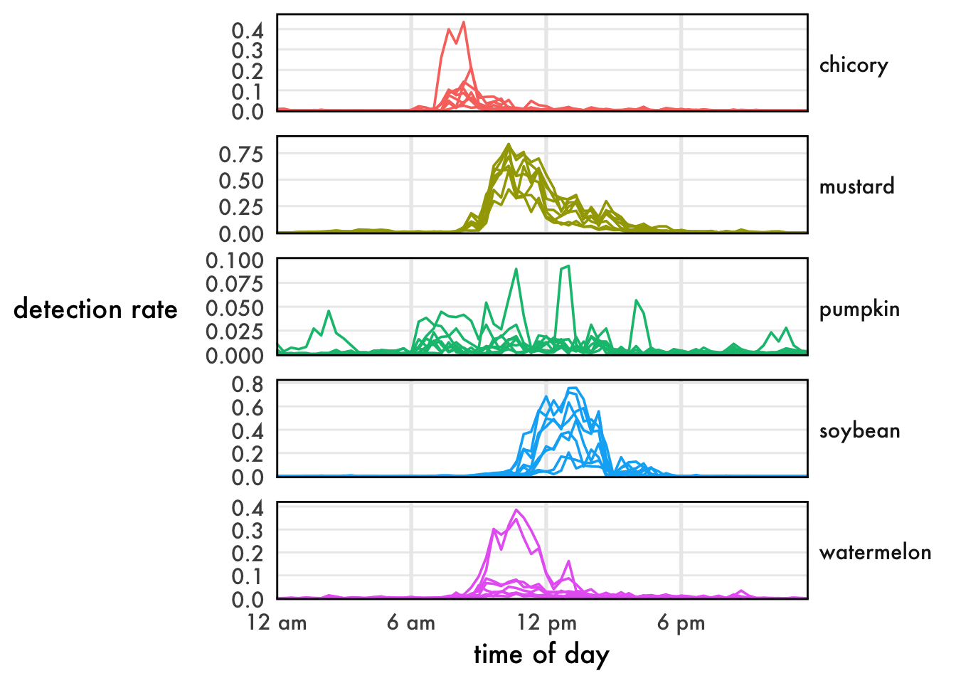 First up, my favorite visualization: the activity curve. This is the trend of pollinator activity across the course of the day for each flower. This isn’t a common visualization; usually researchers are interested in point estimates such as the total number of bees. But activity curves flex the immense temporal resolution of bioacoustics