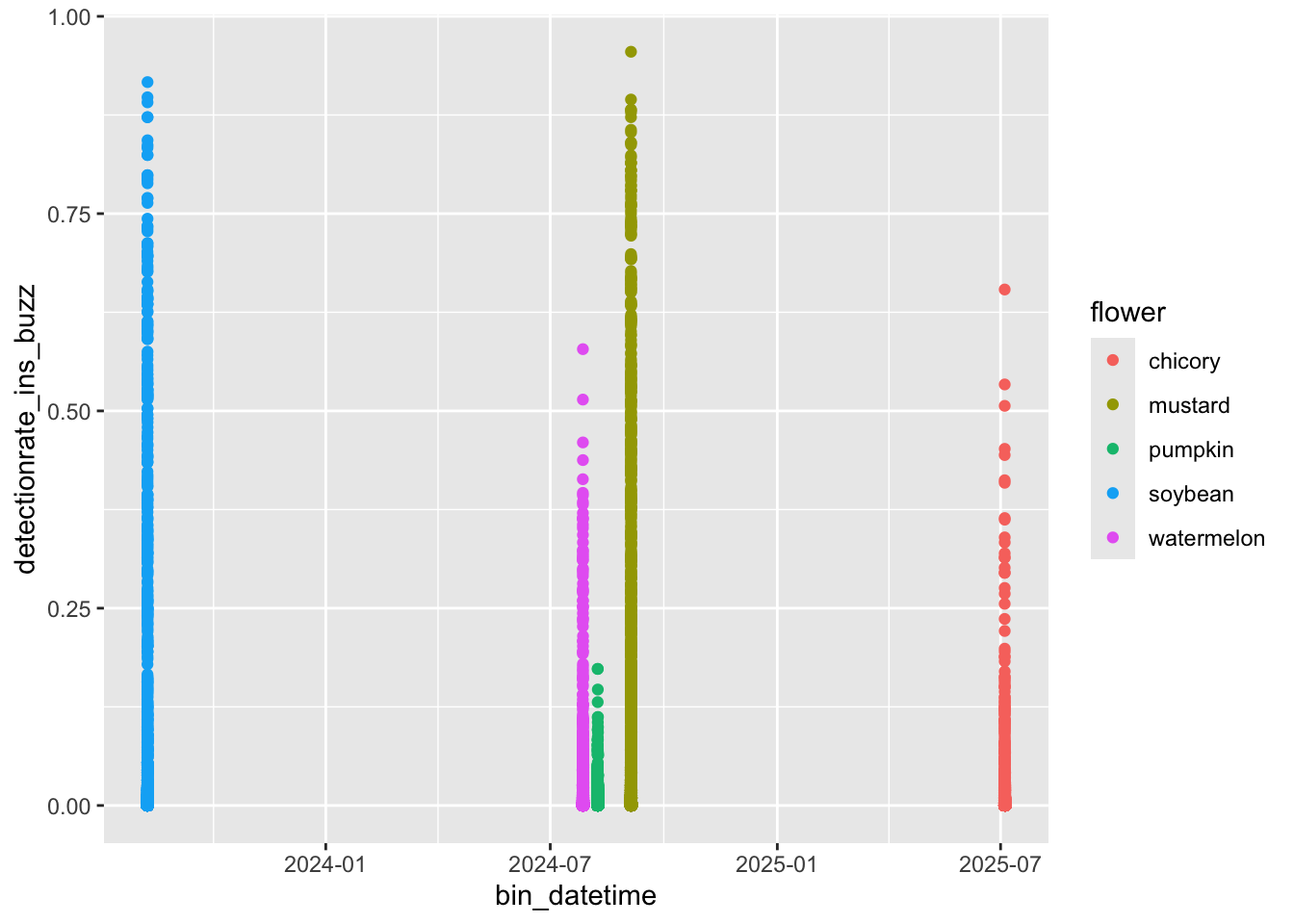 Be careful when interpreting the results from detection rates. Bioacoustics demans a number of unique considerations. Detections are downstream of pollinator loudness, background noise, the amount of buzzing produced by an individual visit (which is downstream of floral morphology), and the quality of buzzing (i.e., different pollinators will produce different sounds). Any of these can become confounds if the experimental design does not account for it. For example, the same number of bees is certain to produce more buzzes in mustard (with numerous, small flowers that they fly between) than it will in watermelon (with fewer, larger flowers that they can land on and walk into). The stats in this section are just demonstrative.